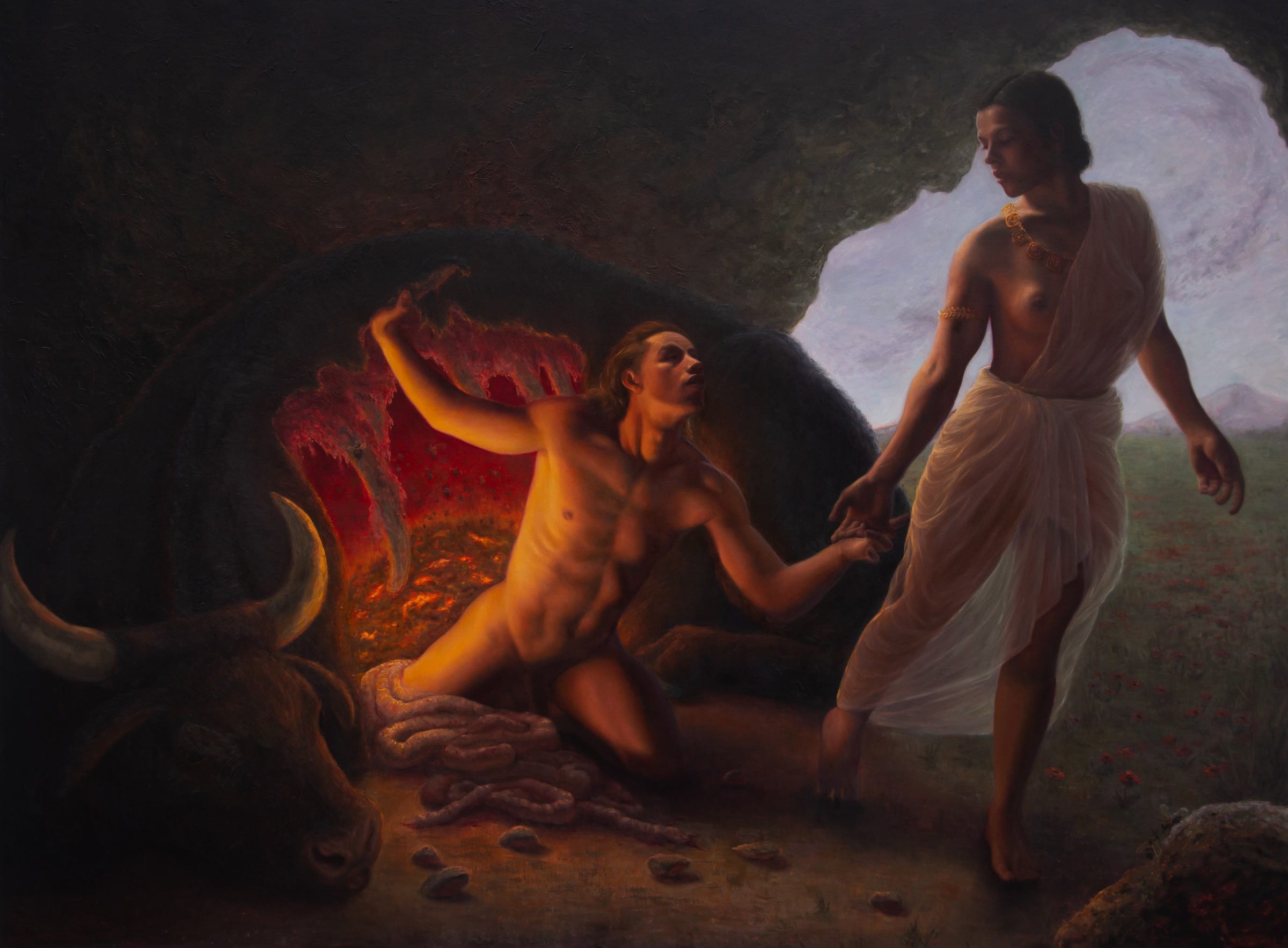 Today’s guest post comes from the excellent newsletter, Painting The Mysteries, by artist Theo Polymorphos. Theo records ethereal visions on canvas, in an evocative bricolage of obscure myths reimagined and personal narratives amplified. Inspired by the countercultural spiritualities of the ancient Orphics and modern Romantics, Polymorphos celebrates his own initiatory journey through visions of a queer otherworld where the youthful protagonists of his paintings are transfigured through encounters with the more than human world of gods and spirits, flora and fauna, elements and luminaries. Brimming with esoteric symbolism—from slithering serpents to glowing hearts—his work explores themes of ecstasy, initiation, and metamorphosis.