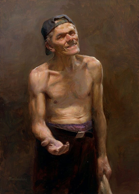 Another way to portray “beauty in ugliness” is through Art that depicts the nobility of the human being, even in the worst of circumstances. The Beggar by Max Ginsburg depicts a homeless man, shirtless, with his hand out and yet, his smile indicates not only is he not broken, but that, in fact, he can still find joy in his heart.