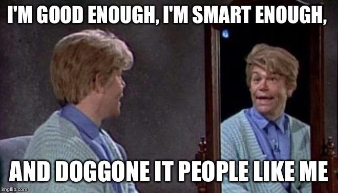 I call this the “Daily Affirmation” method, named after the old Saturday Night Live skit where a character named “Stuart Smalley” looked into a Mirror when he felt he wasn’t worthy of something and said, “I’m good enough, I’m smart enough, and doggone it, people like me!”