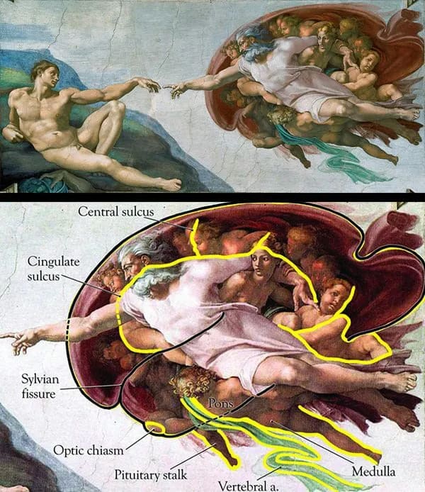 God is offering to make Adam an artist; a creator, “in His image.” God’s forearm is significantly (and symbolically) reaching through the prefrontal cortex — the seat of human uniqueness, reason, and imagination.